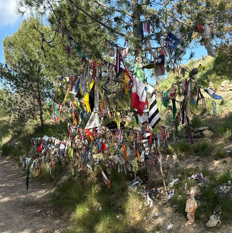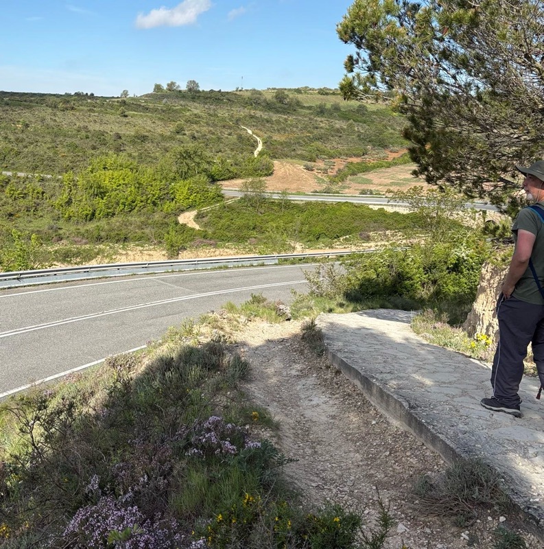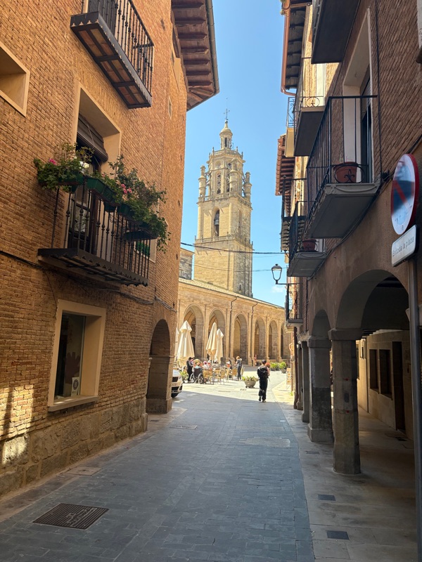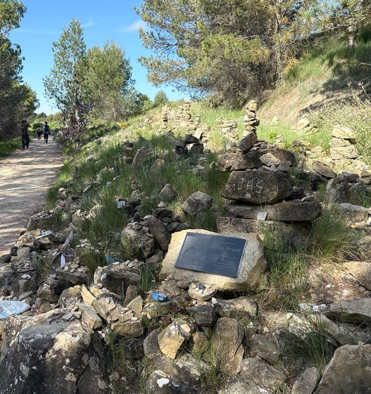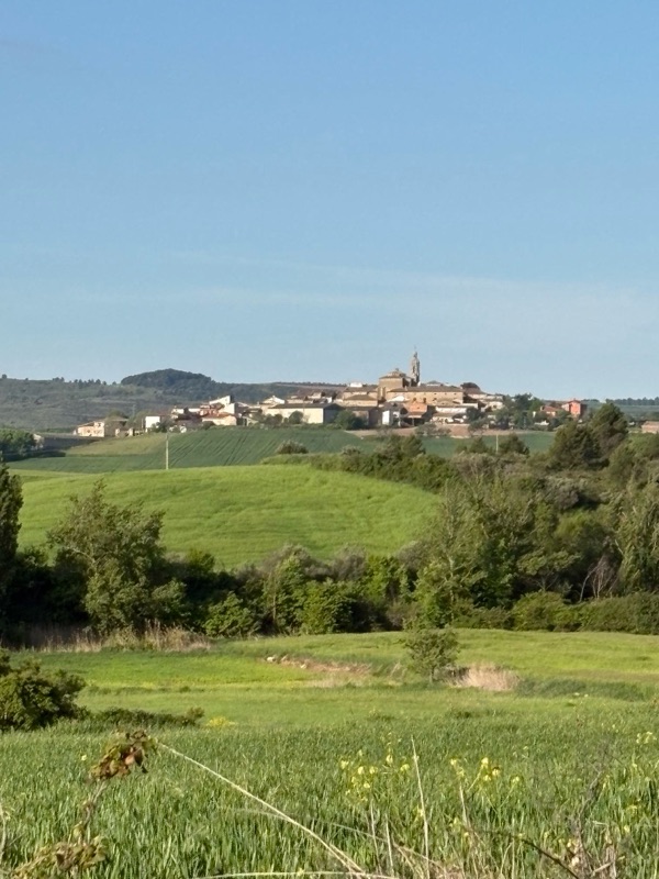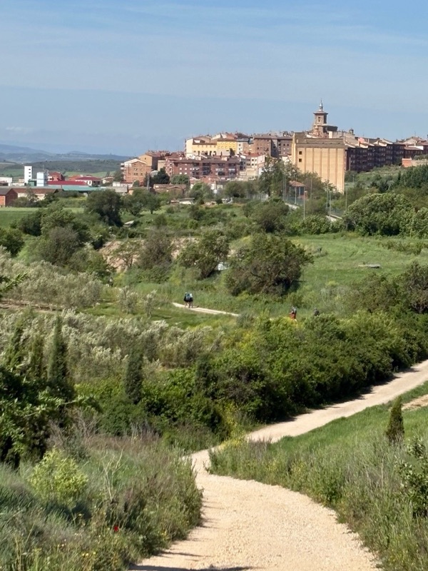 I woke up at 10:30 pm when the power went on and the lights came on. I quickly plugged in all the chargers, checked the internet (not up), turned off the lights and went back to bed. I want to leave early this morning, but breakfast wasn’t until 7:30 and since I had no cash and a hungry stomach I stayed and headed out about 7:55. It was a long day, almost 29 kilometers and an early start would have helped. I passed over 200,000 steps today (94 miles). I feel good but found a second blister on the other foot. So far there is not a major problem. As I left Los Arcos, I saw 2 genuine pilgrims praying the Rosary. Moving! So far the people I have met on the Camino are walking for a personal challenge, a change of vocation or a holiday to get away. Some like my Korean friend has had some major disappointments in his life and is searching for direction and understanding. In past times, it was God they hoped would answer them on the Camino. I think they are still looking for God and His answer, but is not called the same. At any rate, the Camino gives lots of time to think or as my dad would say, “Ruminate.” This physical terrain is changing. It’s drier and more wind. The wheat fields are beginning to head and winds makes these look like shimmering sea of grass. It reminds me of my boyhood home on the eastern plains of Colorado. In Colorado the grain elevators dot the plains of the small towns the way the cathedral bell tours look over the Spanish communities. It is interesting to see wheat field next to vineyards and olive groves. What a marvelous and wonderful land! At one point in the walk, we came to a place where a memorial had been placed and then added to by hundreds of pilgrims. It was quite moving. In addition ribbons and beads where hung by a tree. When I got to Viana, I found a bank and asked for help. I had not had any success with the ATM and was quite concerned about getting some Euros. The manager was so kind to help and the card worked perfectly. I couldn’t believe it. I almost kiss the man. Once again, my worry was getting best of me. I came away thanking for simply making the ATM work. “Your Heavenly Father knows your needs.” It is the simple answers at the right time which seem to touch me deepest. Logon’s is a beautiful city and tonight had dinner and am ready for bed. Another long walk tomorrow. Buen Camino
