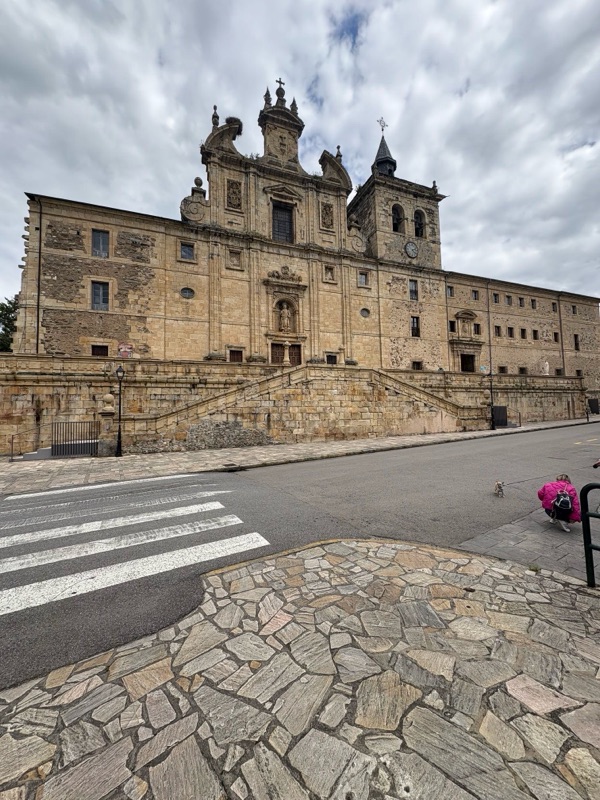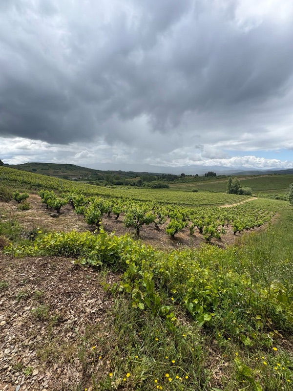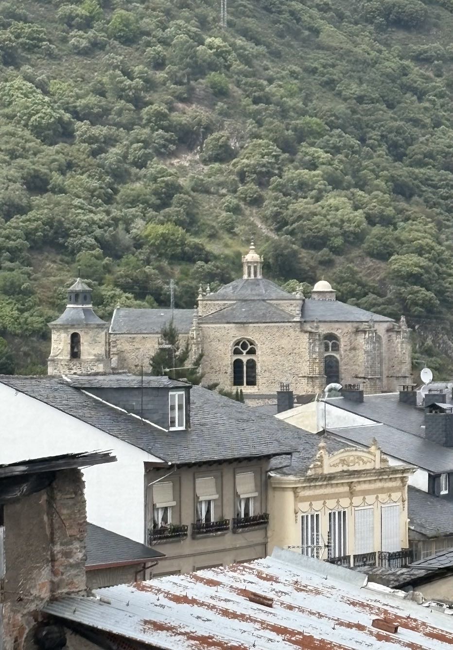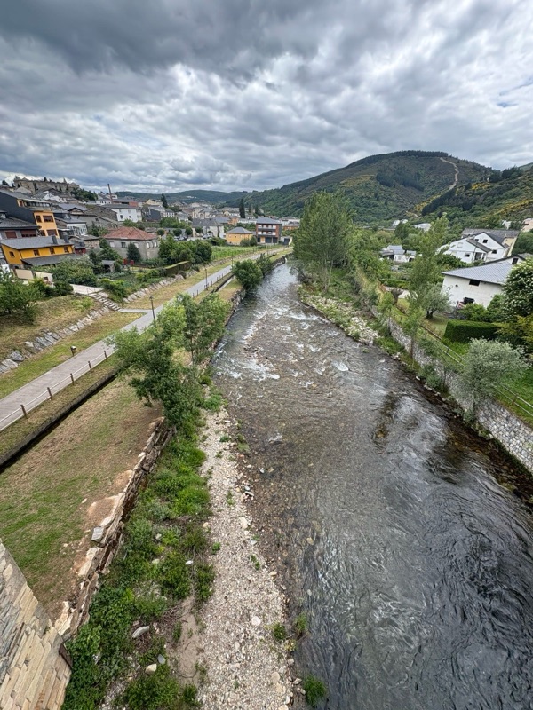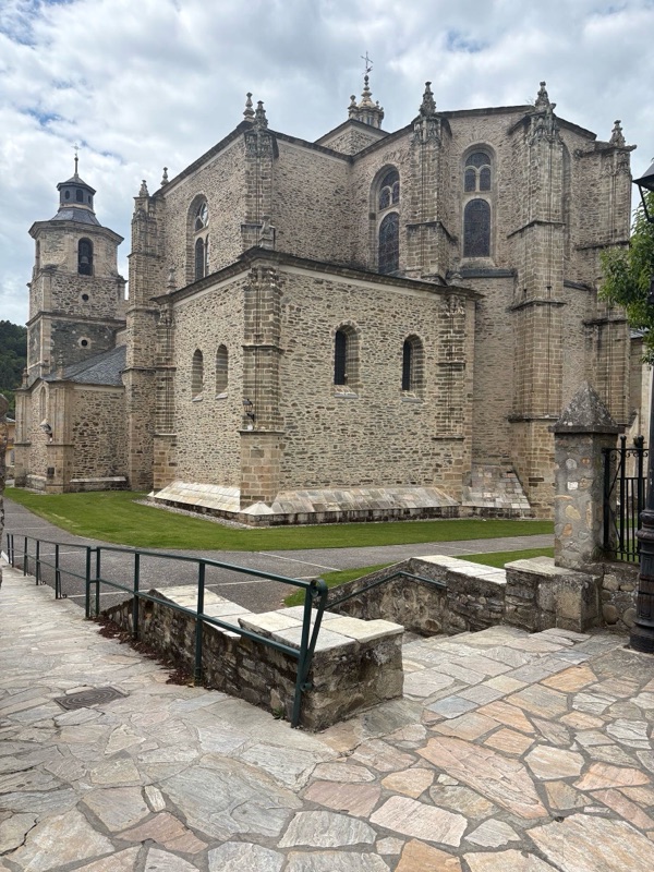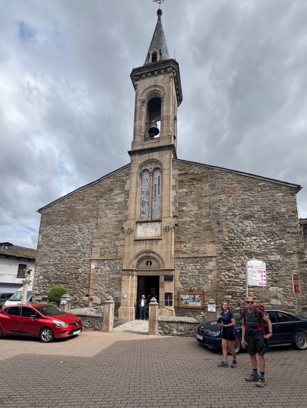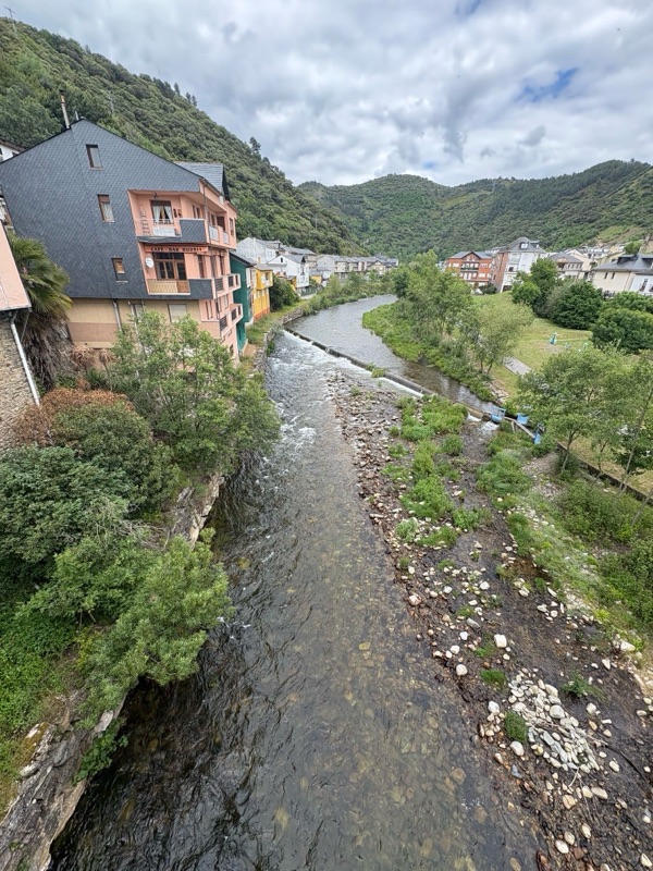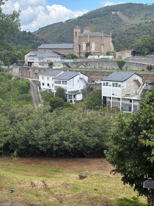 Today was a fairly easy walk. We are slowly making our way to Santiago. Tomorrow I will make my way to a town called Las Herrerias before I make a major climb on Wednesday to O Cebreiro in the region of Galicia. Today we entered another wine area that looks a lot like the Paso Robles area. Beautiful rolling hills with lush fields. The rains have been very good this year, everything is green and lots of flowers blooming. Had an interesting conversation with a Frenchman who spoke English. I asked how he spoke such good English and he said, “because I worked with a bloody English company.” A perfect French answer. The town I arrived at tonight is Villafranca de Bierzo which could pass for a Swiss or Italian ski town. Mountains on all sides. Here are some of the sights for today.