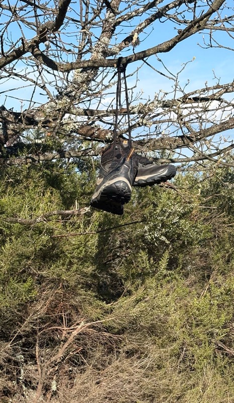 Sometimes shoe give out so you leave them in a tree on the trail (Hope they have another pair, no place to go barefoot)